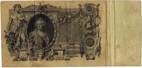 В XVIII в. в мире активно вводятся в оборот банкноты. Россия не становится исключением и 1 февраля 1769 года императрица Екатерина II публикует манифест, в котором объявляется о введении бумажных ассигнаций. Основной причиной была замена медных монет, тяжелых и неудобных для счета. Для обеспечения купюр медными деньгами (а обменивать их предполагалось только на медные монеты, на золотые и серебряные это не распространялось) были созданы два банка, в Москве и Санкт-Петербурге. Уставной капитал обоих составлял по 500 000 рублей, на такую сумму и были отпечатаны ассигнации. По сути это были расписки, по которым можно было получить определенное число монет. Их номинал устанавливался в 100, 75, 50 и 25 рублей. Однако вскоре от банкнот номиналом 75 рублей отказались, в связи с частой их подделкой (их делали из 25 рублевых купюр).