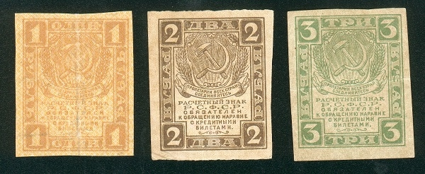 Весной 1918 года отдел изобразительных искусств Совнаркома объявил конкурс на лучший рисунок для первых советских банкнот. В марте 1919 года новые деньги были запущены в обращение. За пестроту и легковесность они получили в народе прозвище мотыльки. На «мотыльках» не указывались ни нумерация, ни год выпуска, зато на них впервые появился герб РСФСР. В 1921 году к прежним «мотылькам» достоинством 1, 2 и 3 рубля добавился знак в 5 рублей, а затем появилась купюра в 50 рублей с новым рисунком.