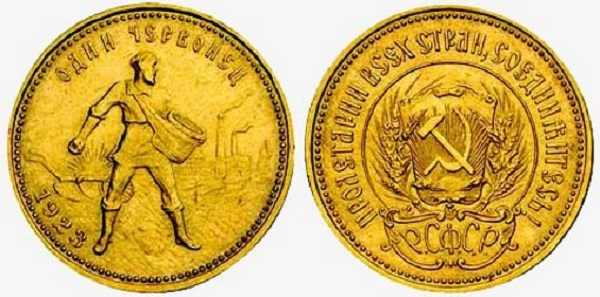 В ноябре 1922 года Совнарком принял решение о выпуске новых банковских билетов - червонцев. Так назывались в XVII веке золотые наградные монеты. Один червонец приравнивался к 10 золотым рублям дореволюционной чеканки, на 25 % обеспечивался золотом, а в остальном - разными ходовыми товарами в виде векселей. Червонец имел изображение только на одной стороне, другая оставалась чистой. На нем печатался государственный герб РСФСР, указывались серия, номер и год выпуска, ставились подписи членов правления Государственного банка РСФСР. Эта купюра стала первым советским устойчивым денежным знаком. Одновременно был начат выпуск золотого червонца в виде монеты, чего не делалось со времен Николая II. По размеру, весу и пробе он как раз соответствовал 10 «царским» золотым рублям. На лицевой стороне монеты изображался герб РСФСР, на оборотной – крестьянин сеятель.