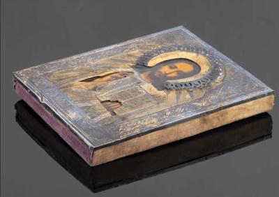 2. Оклад. Часто поверх доски накладывались листы серебра, золота или другого металла, в котором делали специальные отверстия для ликов, рук святых - оклады. От наличия оклада зависело состояние иконы, так как он защищал ее от копоти от свечей, влажности или сухости. Их часто украшали художественной чеканкой, драгоценными камнями. Иногда драгоценными металлами или камнями украшалась только отдельная часть изображения. Если у старинной иконы сохранился такой оклад, то это сразу значительно увеличивает ее рыночную стоимость, особенно, если речь идет о серебряном или золотом окладе. Очень высоко ценятся оклады с эмалью. Например, икона "Пантократор" в окладе работы мастерской Карла Фаберже была продана за 780 тысяч долларов на аукционе Sotheby’s в 2008 году.
