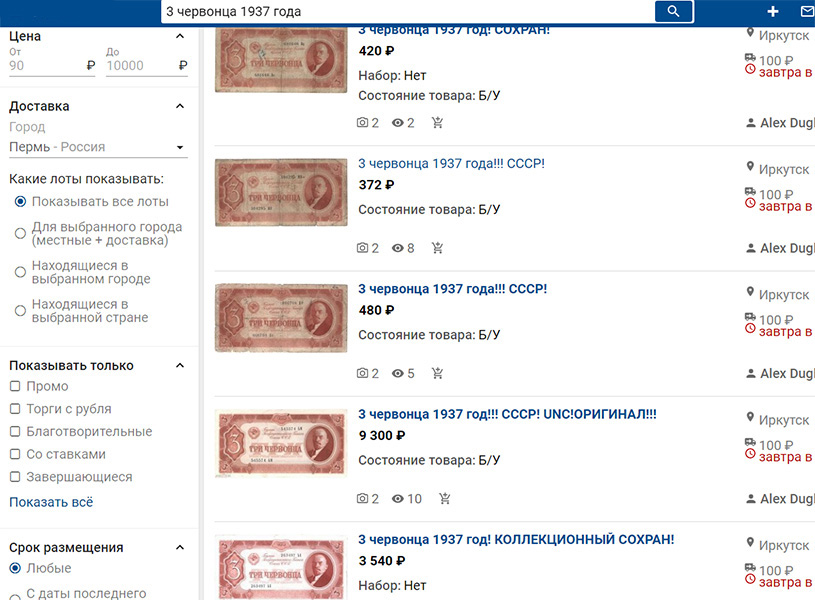 Рыночную стоимость банкноты проще всего понять, если проследить по какой цене её продают интернет-платформы, ориентированные на коллекционеров. Зная год выпуска и номинал банкноты, это не займёт много вашего времени. Для примера поищем банкноту 3 червонца 1937 года на одном из известных российских аукционов. Предварительно надо сделать выборку по признаку «Купить сейчас». На первый взгляд показанный выше разброс от 372 до 9300 рублей не позволяет узнать актуальную рыночную цену. Но если уверенно ориентироваться в степени сохранности каждой боны (градации состояния банкнот будут приведены ниже), множество вопросов сразу отпадёт.