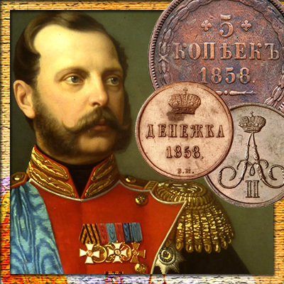 Император Всероссийский, Царь Польский и Великий князь Финляндский Александр II принял Российскую империю под своё управление 18 февраля (2 марта) 1855 года. Страна вела затяжную войну с Англией, Францией, Турцией и их союзниками, при этом особых успехов не имея. Война ввергла российский бюджет в огромный финансовый провал, поэтому России пришлось согласиться на австрийский ультиматум и начать мирные переговоры. Курс бумажного рубля заметно снизился к серебру, а сами серебряные деньги усиленно вывозились за границу, так как там их можно было продать как металл. По утверждениям Николая Павловича Фоллендорфа, из-за этого периодически возникал дефицит мелкой разменной монеты, и на местах городские управы или банковские конторы восполняли нехватку металлической мелочи бумажными суррогатами. Поэтому нумизматам период правления Александра II больше запомнился изменениями на серебряных монетах, постепенно превратившихся в биллон, и появлением на золотых монетах трёхрублёвого номинала. Но и на долю меди тоже выпали преобразования.