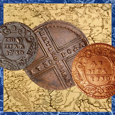 Медные денги и полушки образца 1730 года открыли в российской чеканке новую эру. Указание номинала с датой выпуска на оборотной стороне теперь занимает сложное оформление, собранное из различных растительных элементов. Обозначение монетных дворов на них не проставляли.