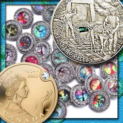 Заканчивая с кристаллами Swarovski, скажем, что разнообразная гамма их оттенков способна творить чудеса в оформлении нумизматических изделий. Примером будет коллекционный набор той же Канады, в составе которого дюжина монет, посвящённая одному из месяцев года. Однако очарование различных цветов можно увидеть и на одной-единственной монете «Магический год Счастья», весящей 400 грамм при диаметре 90 мм. Она изготовлена из серебра 999-й пробы, но часть реверса позолочена, чтобы создать иллюзию видимой нам стороны Луны. Вдоль канта, между лучей серебряного Солнца, расположились разноцветные кристаллы, символизируя собравшихся вместе 12 месяцев.
