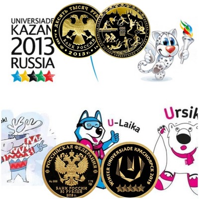 Буква «U» имеет прямое отношение и к талисману, потому что это симпатичное создание носит имя Uni (или Юни на кириллице). Перед нами детёныш крылатого снежного барса, выбранный талисманом XXVII летней Универсиады. Он пришёл с республиканского герба. Снежный барс занимает важное место в геральдике Татарстана, поскольку считается национальным символом этой республики. Мифическое существо связано с татарами уже много веков. Даже в народном восточном календаре здесь тигр заменён барсом. Крылатый барс был тотемом племени барсилов, позже основавшим Волжскую Булгарию. Этот зверь символизирует храбрость, честь и благородство – качества, присущие каждому участнику студенческих соревнований. Оформление обеих монет достаточно простое, потому что это памятно-оборотный выпуск, предназначенный для длительного хождения. В каталоге даже отсутствует имя художника, а в качестве скульптора указано «компьютерное моделирование». Каждую монету отчеканили на СПМД десятимиллионным тиражом. Энтузиасты организовали некоторое количество выпусков монеты с изображением талисмана и логотипа в цвете, но для нумизматов это уже только испорченные экземпляры (официальных цветных монет в этой серии нет).