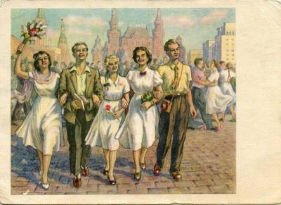 Помимо поздравлений с 8 марта, Новым годом, 1 мая и очередной годовщиной Октябрьской революции, на открытках середины ХХ века появляется Фестиваль молодежи студентов в Москве 1957 года.