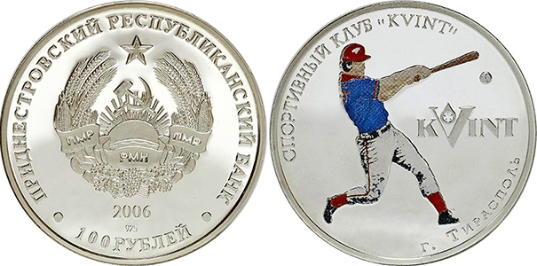 Цветной фрагмент, но уже в виде бейсболиста мы увидим и на приднестровской сторублёвке. Спортивный клуб «KVINT» основан в 1995 году. Его бейсбольная команда была бессменным чемпионом Молдавии с 1996 по 2003 гг. Также приднестровские бейсболисты неоднократно завоёвывали серебро и бронзу чемпионата Украины. Монета, изготовленная в качестве «Proof» из серебра 925-й пробы, входит в серию «Спорт Приднестровья». Масса монеты невелика – всего 14,14 грамма. Невелик и тираж - 250 экземпляров.
