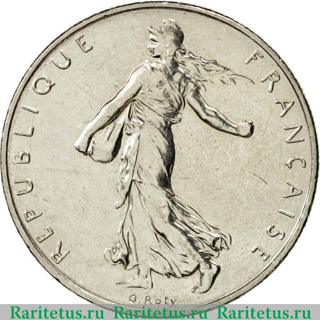 Монетный тип «Сеятельница» разработал в конце XIX века известный гравёр Оскар Роти (Louis-Oscar Roty). Инициативу для появления на деньгах Третьей французской республики новой символики высказал тогда министр финансов Поль Думер. 50 сантимов 1897 года были тепло встречены населением. В память о том выпуске на новый франк решили вернуть без каких-либо изменений не только саму Сеятельницу, но и оформление оборота. Вместе с 1 сантимом 1 франку образца 1960 года можно присвоить чемпионский титул по продолжительности чеканки без изменения дизайна среди французских монет. Однако, если 1 сантим последние два десятилетия чеканился только для наборов, 1 франк имел реальное хождение вплоть до перехода на евро. Кроме монет регулярного чекана 1 франк циркулировал и в виде памятно-оборотных выпусков «Шарль де Голль» (1988 г.), «200-летие устранения Генеральных штатов» (1989 г.), «200-летие Французской республики» (1992 г.), «200 лет института Франции» (1995 г.) и «Жак Рюфф» (1996 г.).
