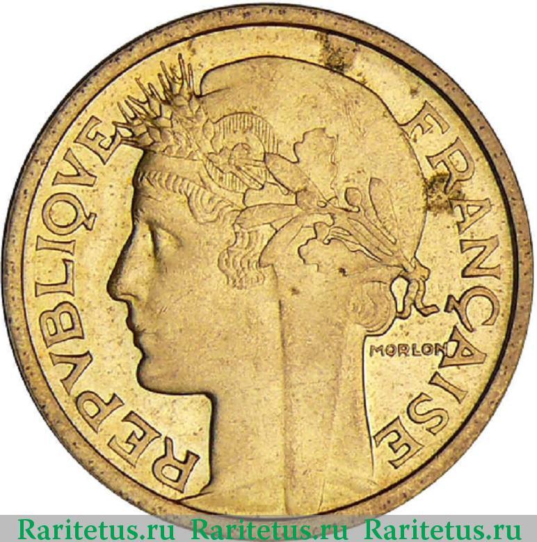 В 1929 году появляется новая линейка монет. 50 сантимов, а также 1 и 2 франка из её состава относятся к типу Морлон (по имени разработчика - Pierre-Alexandre Morlon). На лицевой стороне отчеканено женское воплощение Французской Республики в фригийском колпаке, обвитом колосьями пшеницы и дубовыми листьями. Большую часть оборота занимают два рога изобилия. В оборот возвращается даже серебро – монеты 10 и 20 франков. В это время за 1 фунт стерлингов давали 125 франков, а за 1 доллар США – 25 франков. Впрочем, депрессивные для Франции 1930-е годы постепенно удешевляли франк, и через десять лет он потерял три четверти стоимости.