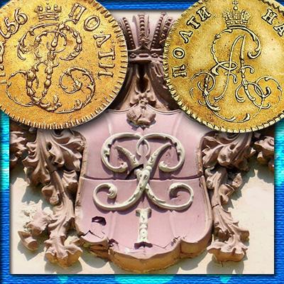 Из двух букв составлен вензель на золотых полтинах (монеты «для дворцового обихода»). Если буква «Е» обозначает имя императрицы, то «А» указывает на принятое ей отчество – «Алексеевна». Запомните начертания этой буквы «А». Мы с ней ещё неоднократно повстречаемся.