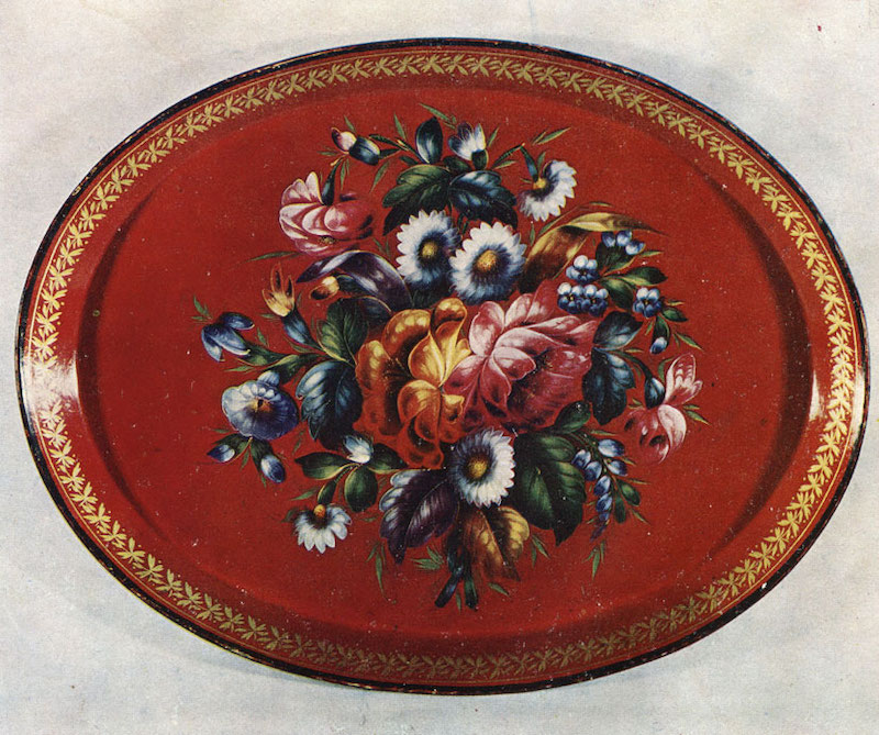 В России были распространены самые разные промыслы: резьба по дереву, вышивка, гончарное дело. В это же время изготовление металлических расписных подносов считалось довольно редким видом прикладного искусства. Жостовское ремесло по росписи подносов можно отнести к художественным лакам – этот декоративный прием зародился еще в Древнем Китае. В России же такие подносы появились в первой половине XVIII веке на Урале на нижнетагильском заводе Демидовых. Вокруг завода стали устраиваться кустарные мастерские, а умельцы расписывали выпускаемую продукцию. Вскоре производство декоративных подносов и лаковую роспись освоили петербургские и подмосковные мастера. Из мастерских выходили подносы разных форм – круглые, овальные, квадратные, восьмиугольные, с бортиками или с волнистыми фестончатыми краями. Расписывали их изысканными орнаментами, фруктами, барочными раковинами и решетками. В это же время поднос стал обязательным атрибутом традиционного русского чаепития наравне с тульским самоваром – его использовали не только как декоративный элемент, но и ставили на него сам самовар.