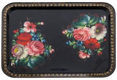 - Цветочная композиция: центром любого жостовского подноса чаще являются цветы (если речь не идет о сюжетной композиции). Существовало несколько типов букетов – «собранные» симметрично в центре подноса; «в раскидку» с увеличенными пространствами между соцветиями; «венком» - расположенные по внешнему краю подноса. Интересно смотрелись букеты, «сдвинутые» в один край подноса – такая ассиметричная роспись встречается не очень часто.