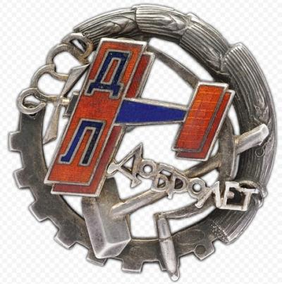 Организация выпустила совсем немного нагрудных знаков. Фактически, единственным, выпускавшимся серийно, был значок компании. К сожалению, доподлинно не известно вручали его всем сотрудникам организации или только самым заслуженным. Существует мнение, что нагрудный знак ДОБРОЛЕТа мог выдаваться всем акционерам компании. Судя по порядковому номеру на оборотной стороне значка, их было вручено, как минимум, 3581 штук. Эскиз был разработан известных советским художником-авангардистом А.М. Родченко.